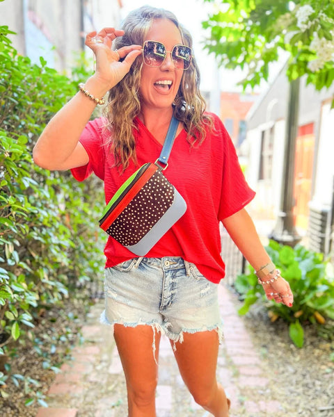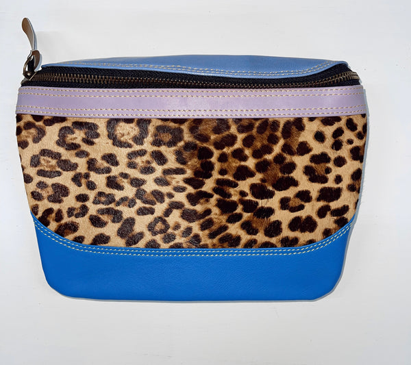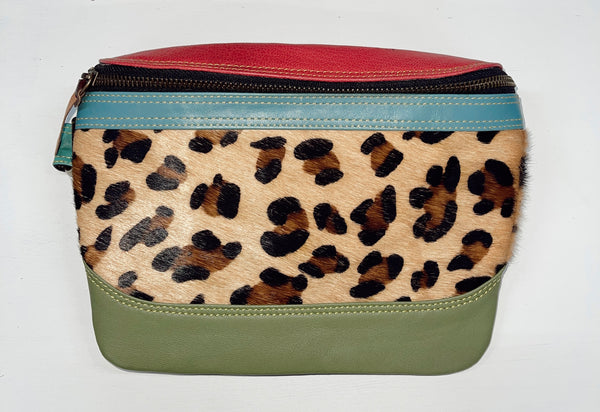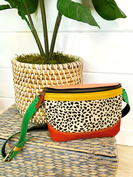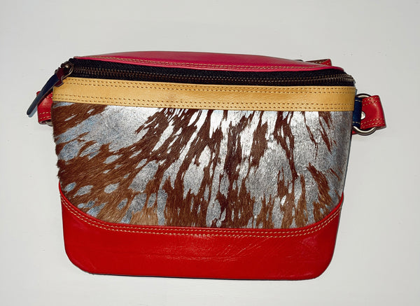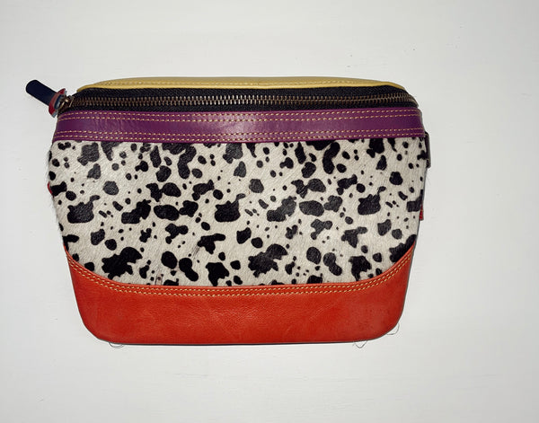 Genuine leather bag featuring bright colors and hair on hide detailing.